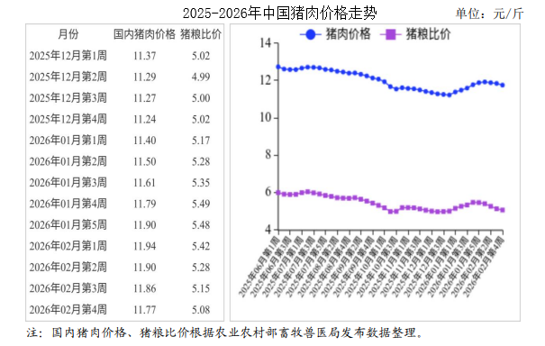 从生产端看,2025年6月之前能繁母猪存栏量持续增加,推算11个月可知2026年5月前生猪存栏量处于高位,生猪及猪肉供应充裕。从消费端看,元宵节过后,前期猪肉库存消化殆尽,随着学校和企业逐步复学复工,团餐消费和餐饮消费增加,经销商对猪肉采购量增加。总体看,预计后期猪肉价格偏弱运行,5月以后或逐步企稳。