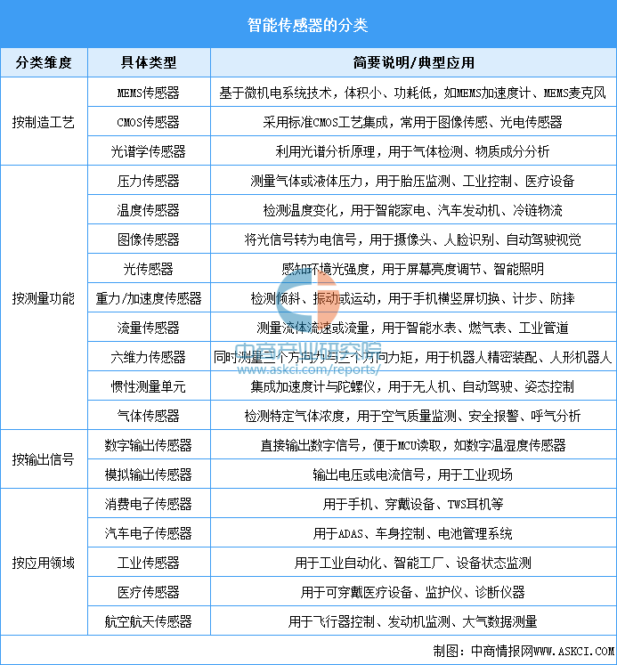 从分类来看,智能传感器按照制造技术主要可分为微机电系统(MEMS)、互补金属氧化物半导体(CMOS)和光谱学三大类。按测量功能划分,则常见类型包括压力传感器、温度传感器、图像传感器、光传感器、重力传感器以及流量传感器等。在应用领域方面,智能传感器应用极为广泛,涵盖了消费电子、汽车电子、工业制造、医疗健康以及航空航天等关键领域,是构筑“新质生产力”的核心底层硬件。