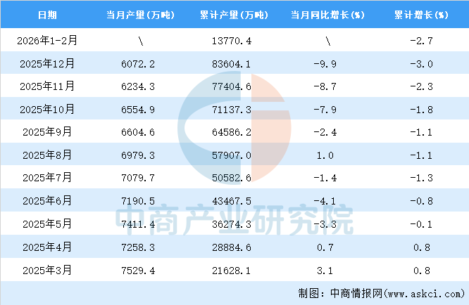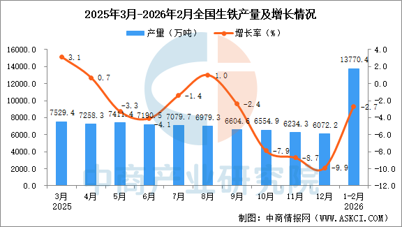 中商情报网讯:据中商产业研究院数据库,2026年1-2月全国生铁当月产量与去年同期相比下降。2026年1-2月全国生铁产量为13770.4万吨,同比下降2.7%。