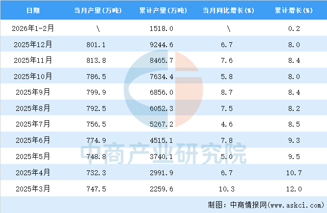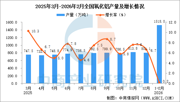 中商情报网讯:据中商产业研究院数据库,2026年1-2月全国氧化铝当月产量与去年同期相比增长。2026年1-2月全国氧化铝产量为1518.0万吨,同比增长0.2%。