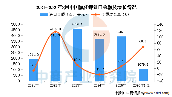 从金额方面来看,数据显示,2026年1-2月中国氯化钾进口金额1079.8百万美元,同比增长68.6%。