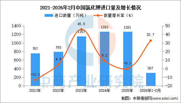 中商情报网讯:据中商产业研究院数据库显示,2025年中国氯化钾进口量1261万吨,同比下降0.1%。最新数据显示,2026年1-2月中国氯化钾进口量307万吨,同比增长32.7%。