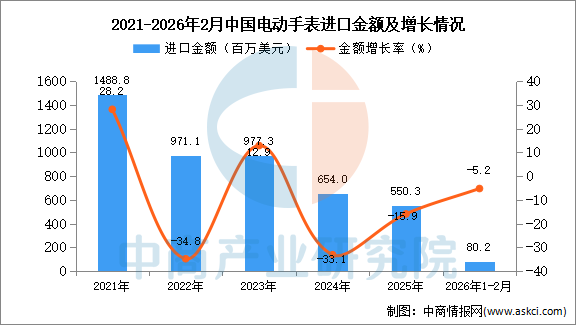 从金额方面来看,数据显示,2026年1-2月中国电动手表进口金额80.2百万美元,同比下降5.2%。