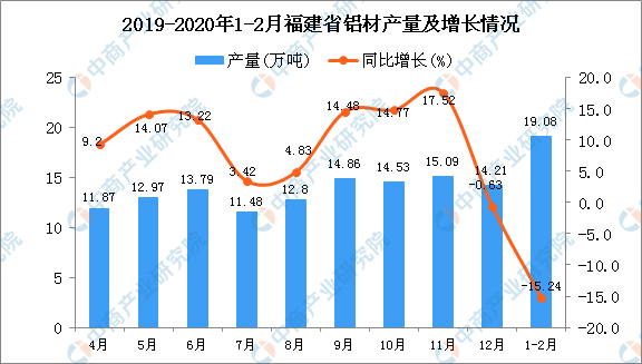 2020年1-2月福建省铝材产量及增长情况
