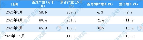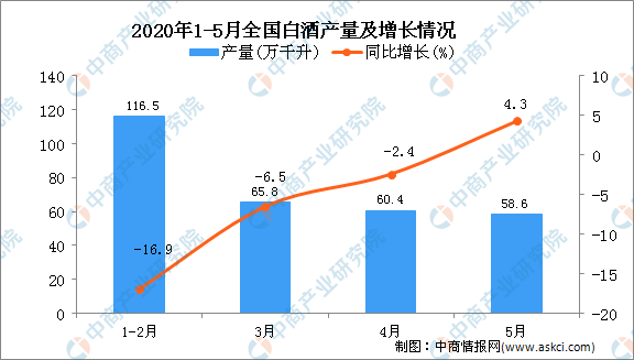 中商情报网讯:据中商产业研究院数据库显示,2020年5月全国白酒产量增长,2020年5月全国白酒产量为58.6万千升,同比增长4.3%。2020年1-5月全国白酒产量为287.2万千升,同比下降9.7%。