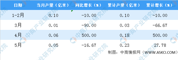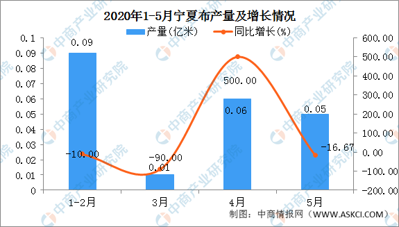 中商情报网讯:据中商产业研究院数据库显示,2020年5月宁夏布产量下降,2020年5月宁夏布产量为0.05亿米,同比下降16.67%。2020年1-5月宁夏原布产量为0.23亿米,同比增长27.78%。