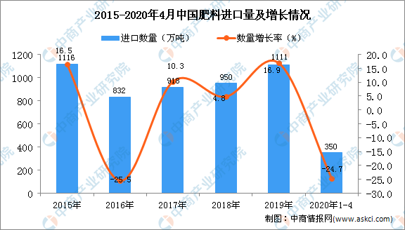 中商情报网讯:据中商产业研究院数据库显示,2020年1-4月中国肥料进口量下降,2020年1-4月中国肥料进口量为350万吨,同比下降24.7%。