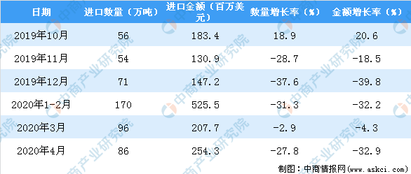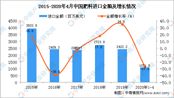 从金额方面来看,2020年1-4月中国肥料进口金额为1071.8百万美元,同比下降27.3%。