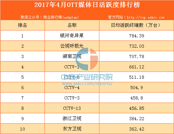 银河奇异果(爱奇艺)、云视听极光(腾讯视频)和湖南卫视继续排在前三位。其中,云视听极光(腾讯视频)和湖南卫视日均活跃终端数都从3月的600万级增加到4月的700万级,银河奇异果(爱奇艺)的日均活跃终端数攀升至近800万级;