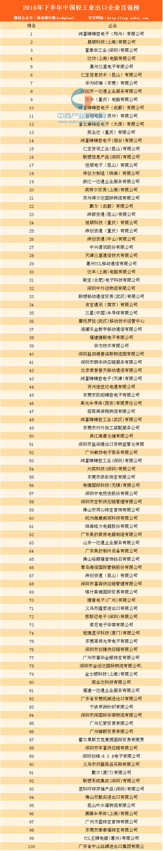 国内轻工业行业正在创新发展。据显示,2016年下半年我国轻工业出口企业百强排名中,鸿富锦精密电子(郑州)有限公司排名第一。以下为具体排名: