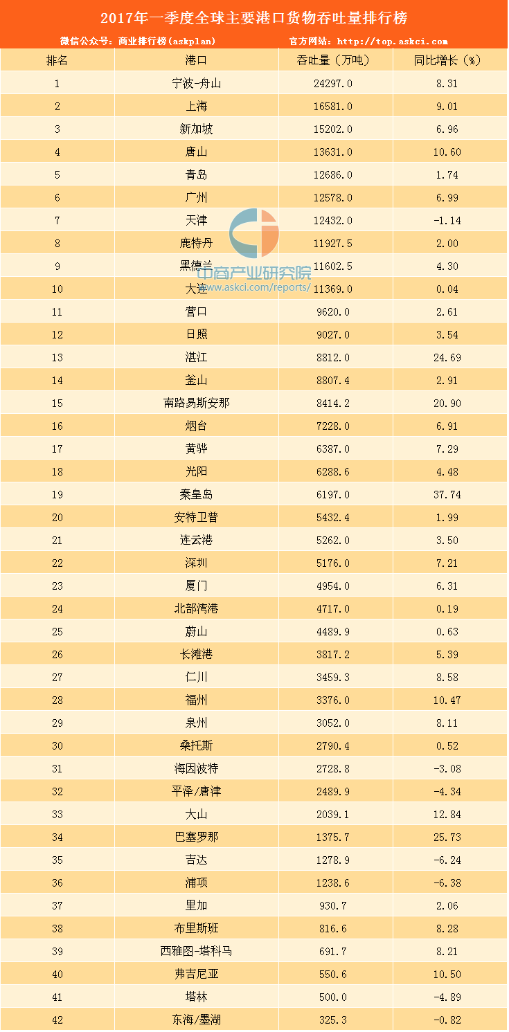 2017年一季度,全球主要港口中宁波-舟山的货物吞吐量排名第一,为24297万吨,同比增长8.31%。以下为具体排名:
