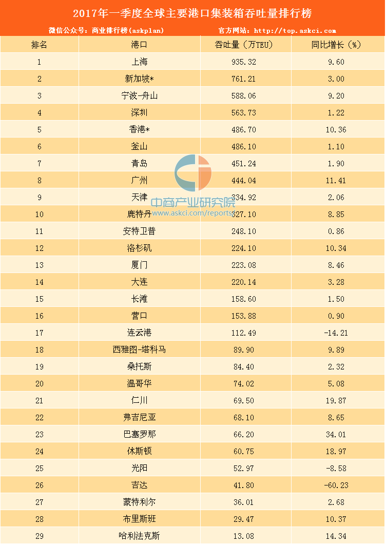 2017年一季度,全球主要港口中上海的集装箱吞吐量排名第一,为935.32万TEU,同比增长9.6%。以下为具体排名: