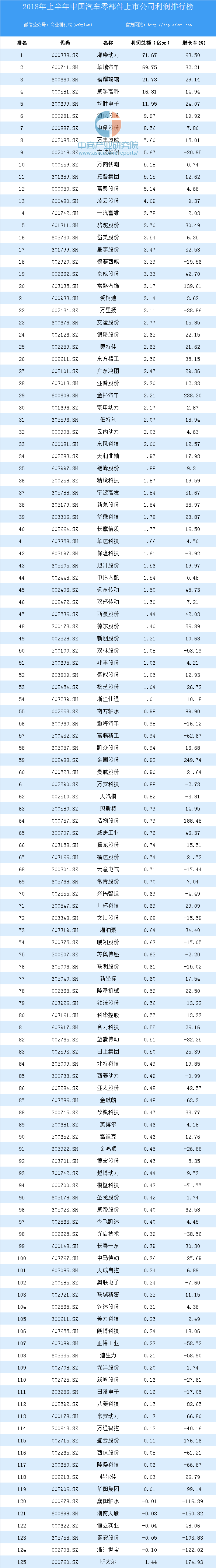 中商情报网讯:目前已经有125家中国汽车零部件上市公司披露了2018半年报,其中125家汽车零部件上市公司75家同比增长的,其中增长幅度最大的是金固股份,同比增长249.74%。50家上市公司同比下降,其中斯太尔同比下降174.93%,下降幅度最多。其中有6家亏损分别为襄阳轴承、湖南天雁、恒立实业、秦安股份、浙江世宝和斯太尔。其中排名前十的汽车零部件公司为潍柴动力、华域汽车、福耀玻璃、威孚高科、均胜电子、银亿股份、中鼎股份、万丰奥威、宁波华翔和万向钱潮。其中这10家上市公司的总利润为228.93亿元。
