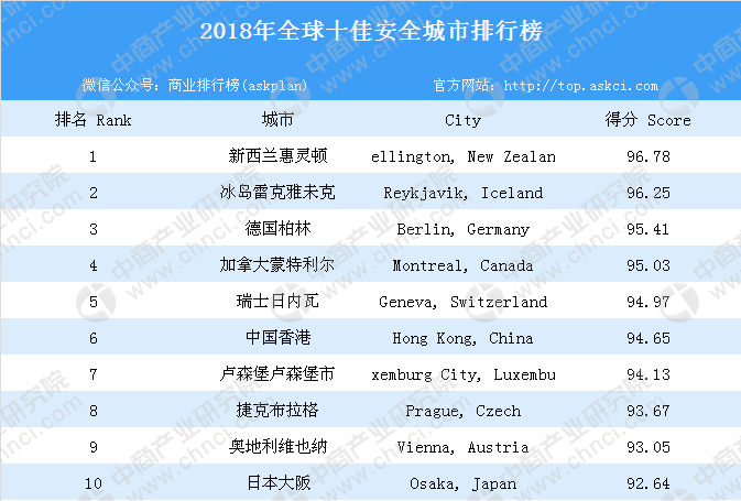 中商情报网讯:由中外城市竞争力研究院、香港桂强芳全球竞争力研究会、世界城市合作发展组织联合制作的第十七届“全球十佳安全城市排行榜”昨日(10月11日)在香港发布。榜单显示,2018年全球十佳安全城市排行榜前十城市分别是新西兰惠灵顿、冰岛雷克雅未克、德国柏林、加拿大蒙特利尔、瑞士日内瓦、中国香港、卢森堡卢森堡市、捷克布拉格、奥地利维也纳和日本大阪。中国仅香港入榜,美国无一城入榜。