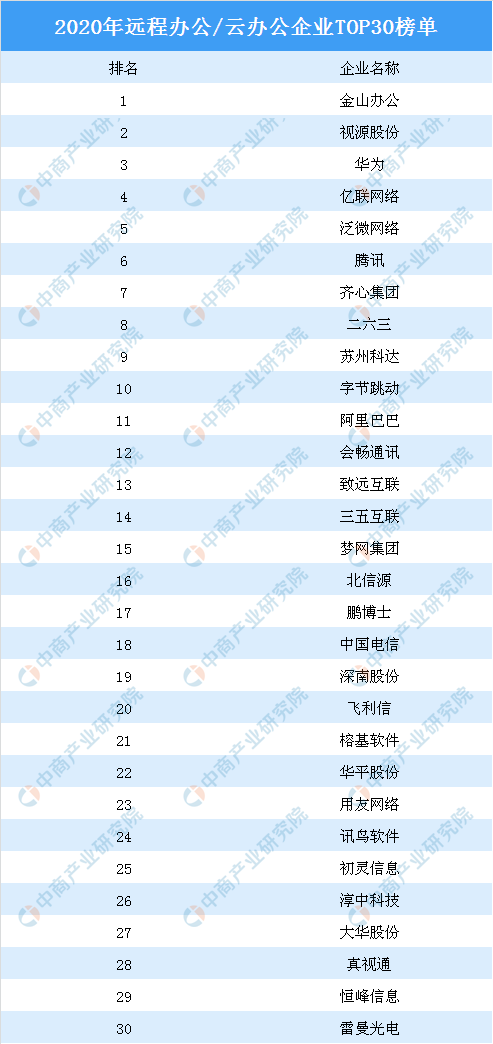 据2020年远程办公/云办公企业TOP30榜单显示:金山办公、视源股份、华为、亿联网络、泛微网络、腾讯、齐心集团、二六三、苏州科达、字节跳动为2020年远程办公/云办公前十大企业。