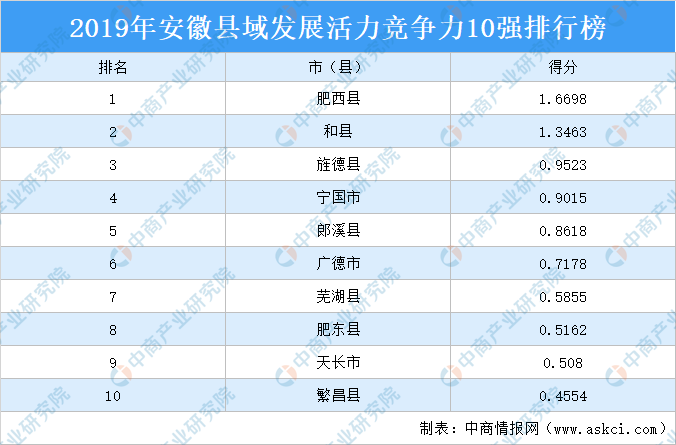 会上《安徽城市发展研究报告2020》发布,同时,“2019安徽县域经济竞争力系列榜单”重磅发布。据2019年安徽县域发展活力竞争力10强榜单榜单显示:肥西县、和县、旌德县、宁国市、郎溪县、广德市、芜湖县、肥东县、天长市、繁昌县10个市县上榜。其中,肥西县以1.6698的得分位居榜首;其次,和县以1.3463分排名第二,旌德县则以0.9523分位列县域发展活力竞争力榜单第三。以下是2019年安徽县域发展活力竞争力10强榜单详细排名情况: