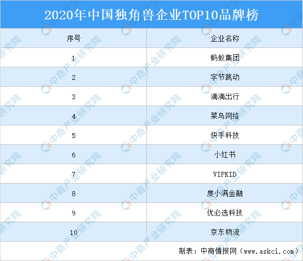 据2020年中国独角兽企业TOP10品牌榜单显示:蚂蚁集团、字节跳动、滴滴出行、菜鸟网络、快手科技、小红书、VIPKID、度小满金融、优必选科技以及京东物流上榜。据了解,2020独角兽企业品牌榜是通过对全球公开大数据进行专业深度的分析,综合品牌的媒体指数、社交指数和好感度计算出的品牌综合影响力指数,由封面研究院联合中译语通推出,通过数据报告为新经济发展提供智力支持。以下是榜单详细情况: