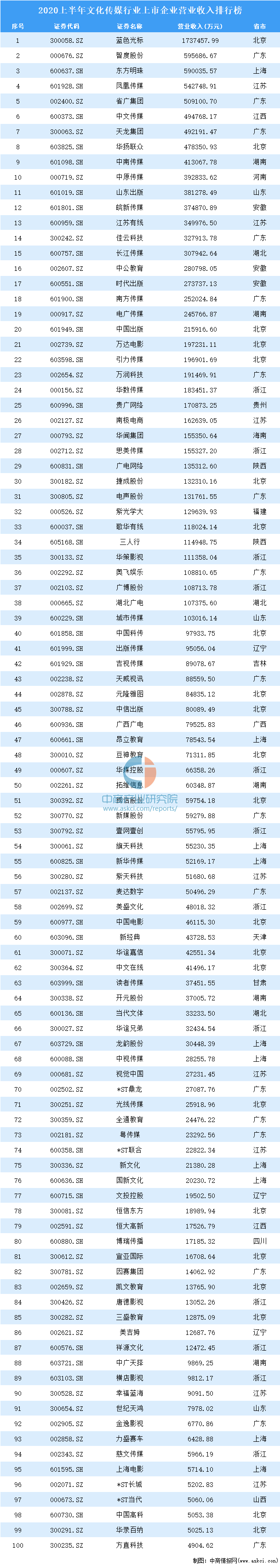 据榜单显示:蓝色光标、智度股份、东方明珠、凤凰传媒、省广集团、中文传媒、天龙集团、华扬联众、中南传媒、中原传媒为2020上半年文化传媒行业上市企业营业收入榜单前十企业。据统计,前十企业营业收入共计624.62亿元,占榜单的44.25%。其中,营业收入位居第一的是来自北京的蓝色光标,达173.75亿元。智度股份位居第二,营业收入为59.57亿元。东方明珠位居第三,营业收入为59亿元。