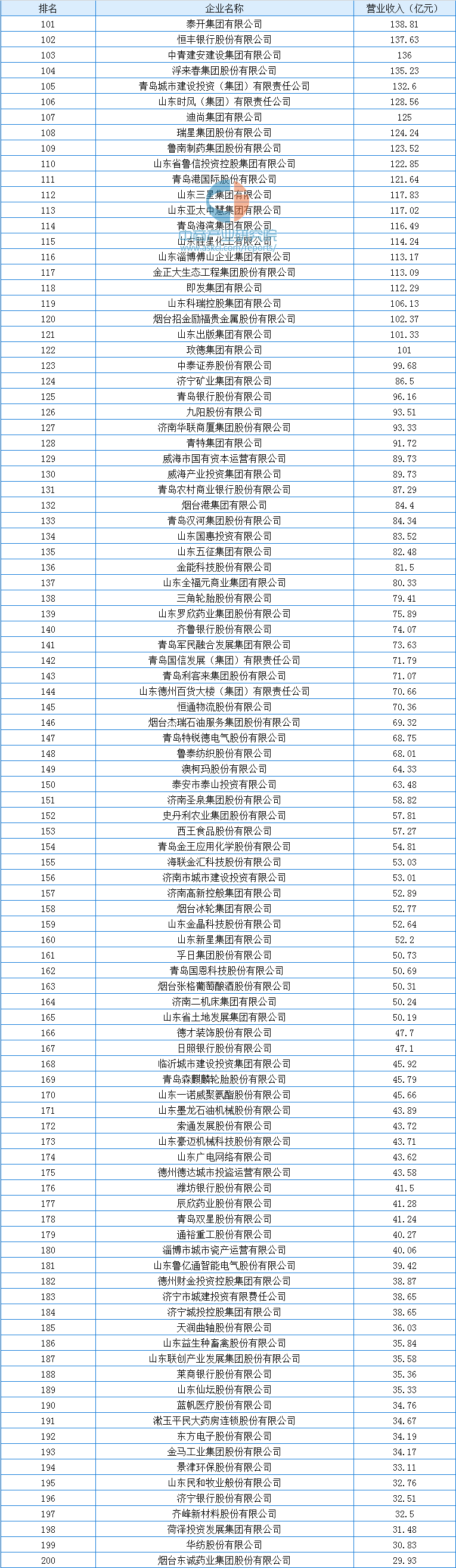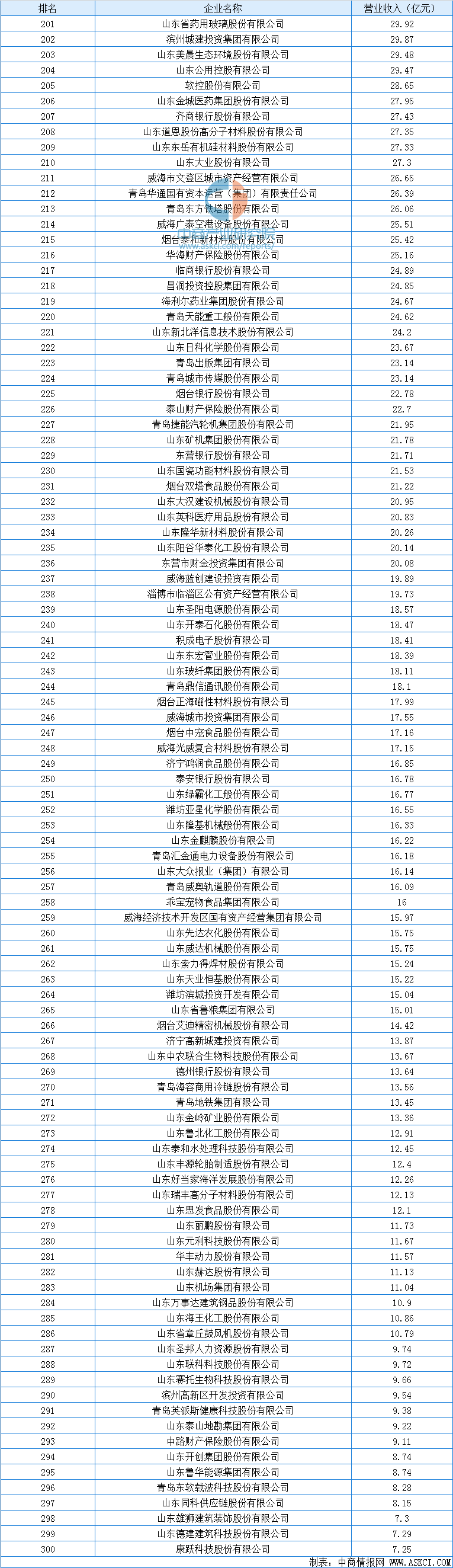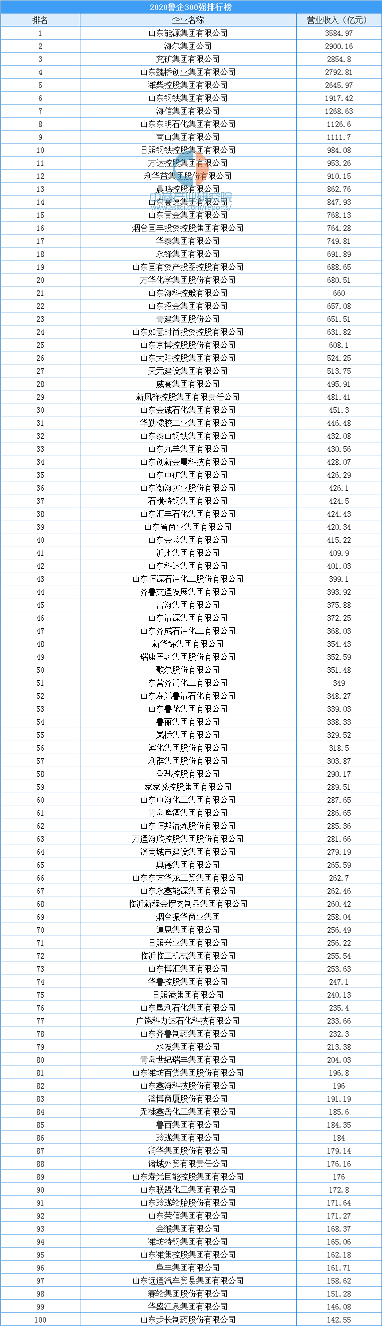 在2020鲁企300强中,山东能源集团以3584.97亿元营收位居榜首,海尔集团以2900.16亿元营收夺得亚军,入围鲁企10强的还有兖矿集团、山东魏桥创业集团、潍柴控股集团、山东钢铁集团、海信集团、山东东明石化集团、南山集团和日照钢铁控股集团。