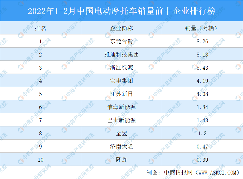 中商情报网讯:2022年1-2月,电动摩托车产销37.29万辆和37.33万辆,同比下降28.13%和26.21%。前十企业电动摩托车销量35.57万辆,占比95.3%。