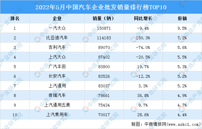 中商情报网讯:2022年5月,中国汽车批发销量前十企业分别为一汽大众、比亚迪汽车、吉利汽车、上汽大众、广汽丰田、长安汽车、上汽通用、奇瑞汽车、上汽通用五菱、上汽乘用车。TOP10汽车企业合计销售91.6万辆,市场集中度达57.5%。一汽大众销量最高,为15.1万辆,同比下降9.4%,市场占有率9.5%。