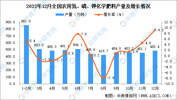 2022年12月全国农用氮、磷、钾化学肥料产量为482.4万吨,同比增长9.2%。2022年1-12月全国农用氮、磷、钾化学肥料产量5471.9万吨,同增长1.2%。