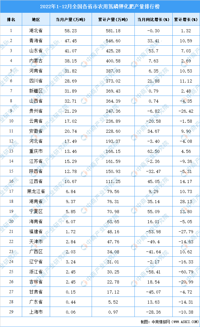 2022年1-12月全国农用氮磷钾化肥产量前十省市分别是湖北省、青海省、山东省、内蒙古、河南省、四川省、新疆区、山西省、贵州省、云南省。其中,2022年1-12月湖北省农用氮磷钾化肥产量排名第一,累计产量为581.18万吨。