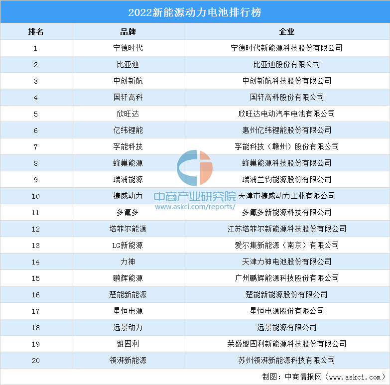 中商情报网讯:近日,互联网周刊发布了“2022新能源动力电池排行榜”。榜单显示,宁德时代、比亚迪、中创新航、国轩高科、欣旺达、亿纬锂能、孚能科技、蜂巢能源、瑞浦能源、捷威动力进入榜单前十。