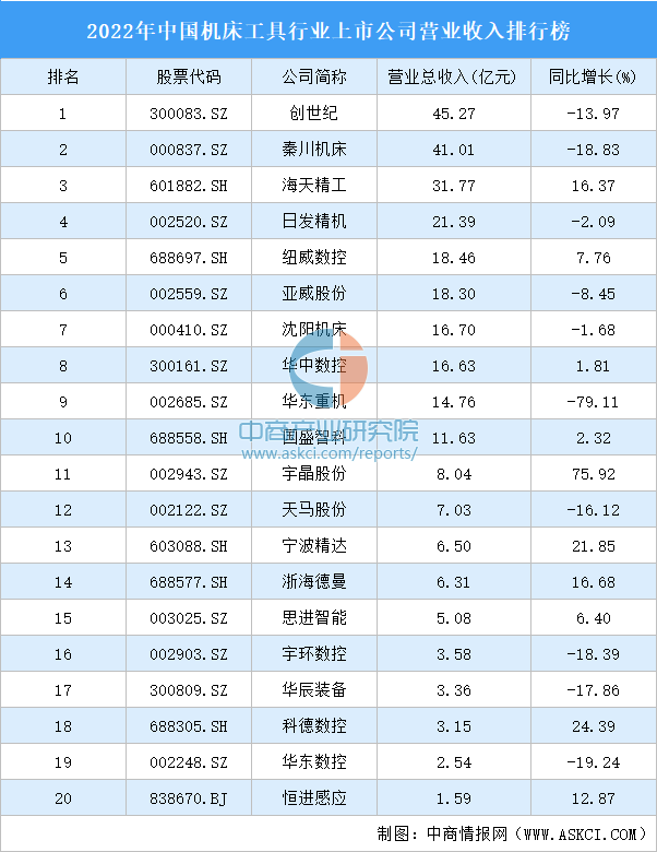 中商情报网讯:近日,沪深A股上市企业陆续公布经营情况,截止目前,机床工具行业共有20家企业公布2022年经营情况,20家企业营业收入合计283.13亿元,其中10家公司营业收入超10亿,4家公司营业收入超20亿。创世纪营业收入最高达45.27亿元,秦川机床、海天精工排名第二和第三,营业收入分别为41.01亿元、31.77亿元。日发精机、纽威数控、亚威股份、沈阳机床、华中数控、华东重机、国盛智科进入前十,营业收入依次排名第4-10名。