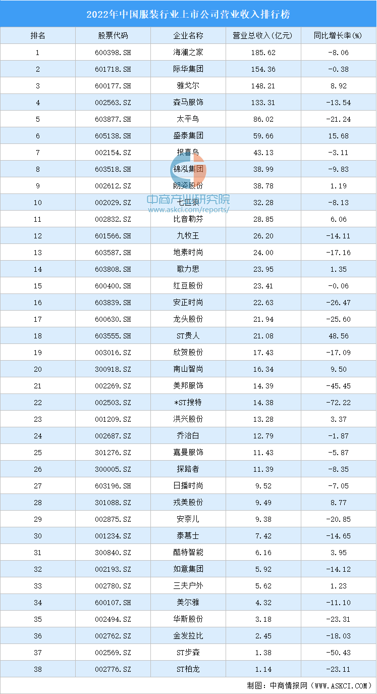 中商情报网讯:近日,沪深A股上市企业陆续公布经营情况,截止目前,服装行业共有38家企业公布2022年经营情况,38家企业营业收入合计1289.87亿元,其中6家企业营业收入超50亿,4家企业营业收入超百亿。海澜之家营业收入最高达185.62亿元,际华集团、雅戈尔排名第二和第三,营业收入分别为154.36亿元、148.21亿元。森马服饰、太平鸟、盛泰集团、报喜鸟、锦泓集团、朗姿股份、七匹狼进入前十,营业收入依次排名第4-10名。