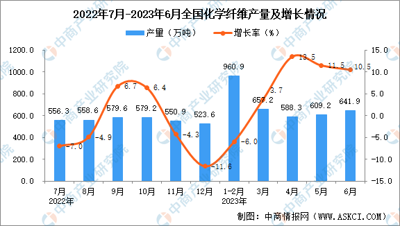 中商情报网讯:据中商产业研究院数据库显示,2023年6月全国化学纤维当月产量与去年同期相比增长。2023年6月全国化学纤维产量为641.9万吨,同比增长10.5%。2023年1-6月全国化学纤维产量3381.6万吨,同比增长3.9%。