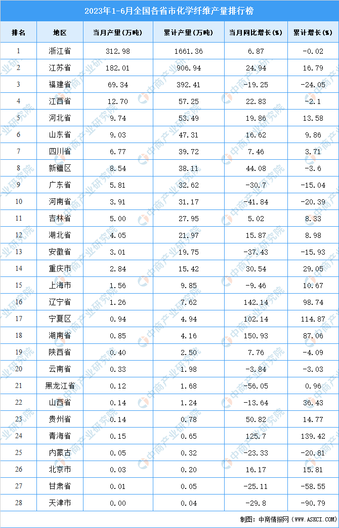 2023年上半年全国化学纤维产量前十省市分别是浙江省、江苏省、福建省、江西省、河北省、山东省、四川省、新疆区、广东省、河南省。其中,2023年上半年浙江省化学纤维产量排名第一,累计产量为1661.36万吨。
