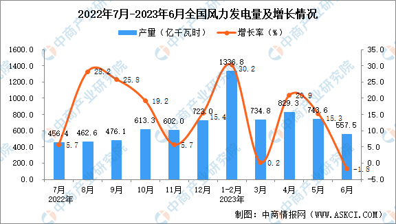 中商情报网讯:据中商产业研究院数据库显示,2023年6月全国风力发电量为557.5亿千瓦时,同比下降1.8%。2023年1-6月全国风力发电量为4246.4亿千瓦时,同比增长16.0%。
