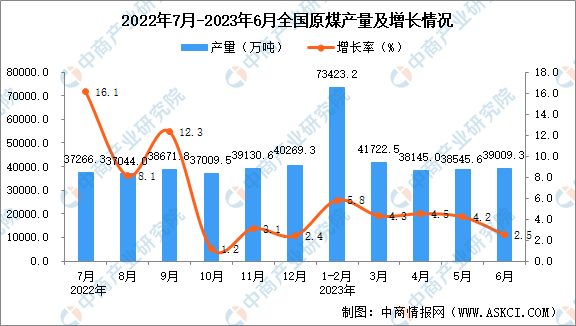 中商情报网讯:据中商产业研究院数据库显示,2023年6月全国原煤产量为39009.3万吨,同比增长2.5%。2023年1-6月全国原煤产量为230053.6万吨,同比增长4.4%。