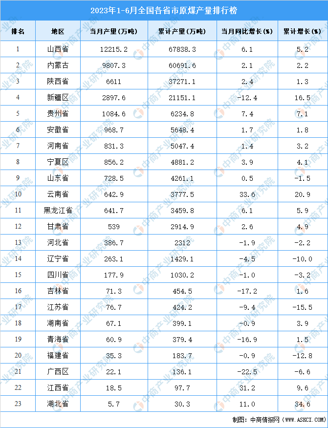 2023年上半年全国原煤产量前十省市分别是山西省、內蒙古、陕西省、新疆区、贵州省、安徽省、河南省、宁夏区、山东省、云南省。其中,2023年上半年山西省原煤产量排名第一,累计产量为67838.3万吨。