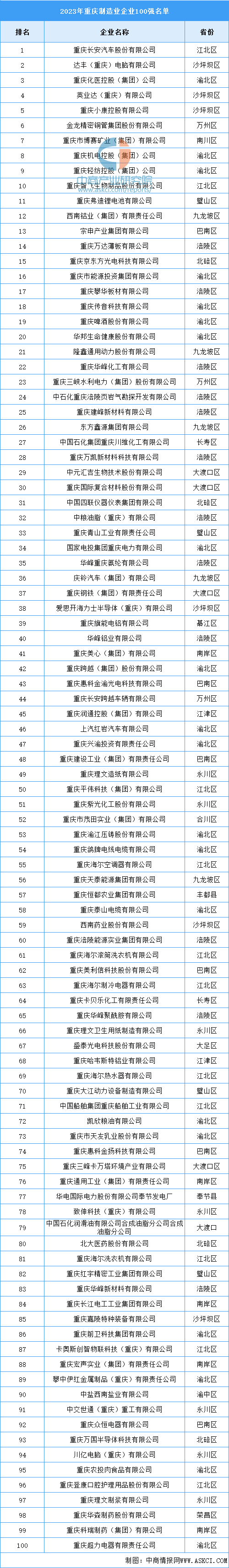 中商情报网讯:近日,重庆市企业联合会(企业家协会)召开“2023重庆百强企业发布会”,发布了2023重庆制造业企业100强榜单。榜单显示,前十企业分别为重庆长安汽车股份有限公司、达丰(重庆)电脑有限公司、重庆化医控股(集团)公司、英业达(重庆)有限公司、重庆小康控股有限公司、金龙精密铜管集团股份有限公司、重庆市博赛矿业(集团)有限公司、重庆机电控股(集团)公司、重庆轻纺控股(集团)公司、重庆智飞生物制品股份有限公司。