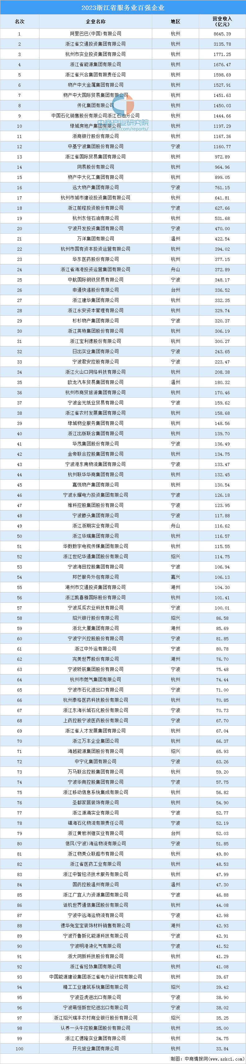 中商情报网讯:近日,浙江省企业联合会发布了“2023浙江省服务业百强企业”榜单。榜单显示,2023浙江省百强企业全年实现营业收入总额达41961.57亿元,入围门槛33.84亿元。其中,12家企业营业收入超过千亿元,5家企业营业收入超百亿元。