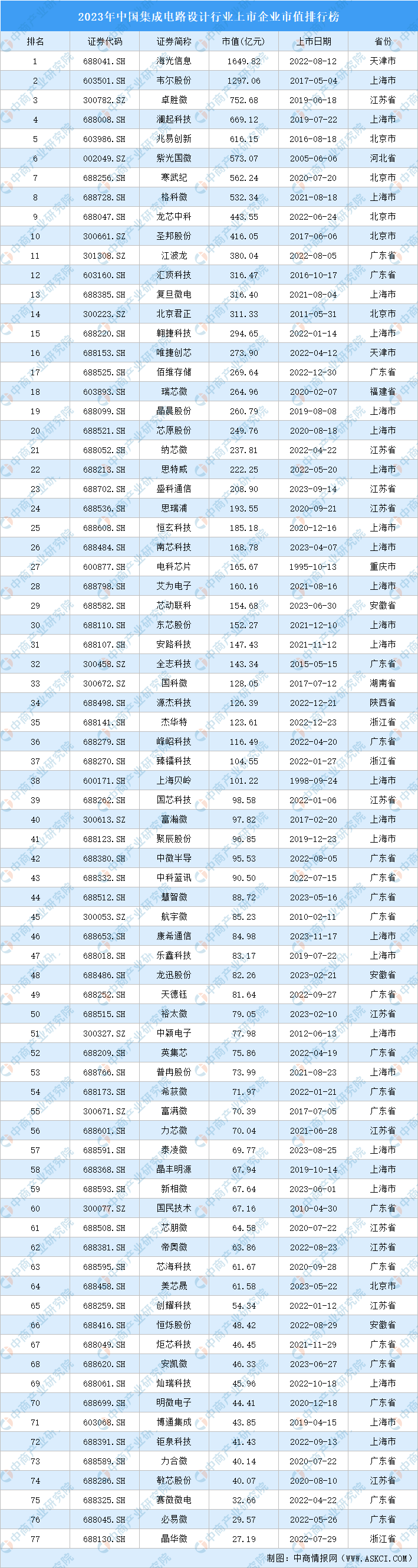 中商情报网讯:截止2023年12月29日,集成电路设计行业77家上市公司市值共计1.59万亿。8家上市公司市值超500亿元,2家上市公司市值超1000亿。