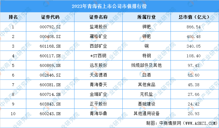 其中,盐湖股份市值最高达866.54亿元,藏格矿业、西部矿业排名第二和第三,市值分别为400.48亿元、340.05亿元。*ST西钢、远东股份、天佑德酒、青海春天、金瑞矿业、正平股份、青海华鼎依次排名第4-10名。