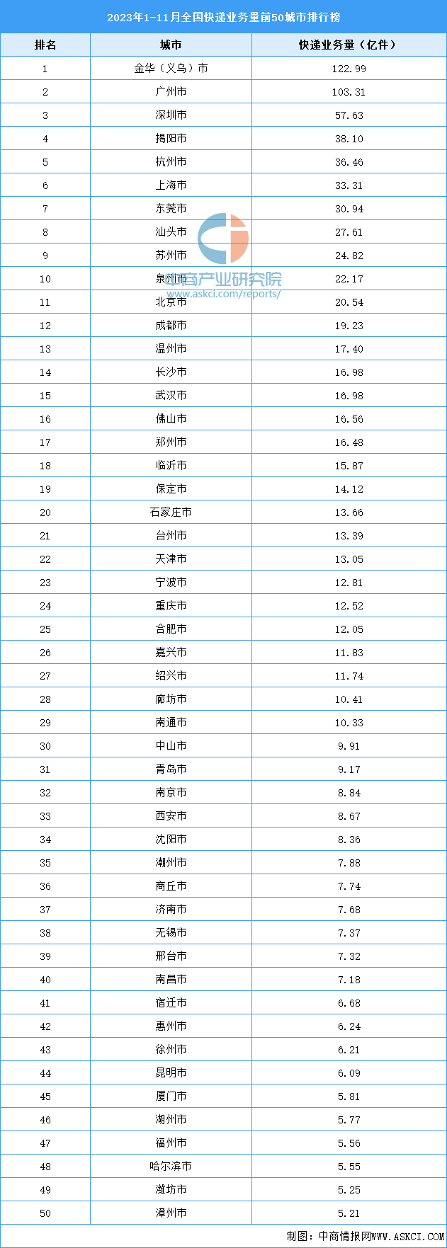 2023年1-11月,全国快递业务量前50城市中,金华(义乌)市快递业务量最高,达122.99亿件。排名前十城市分别为金华(义乌)市、广州市、深圳市、揭阳市、杭州市、上海市、东莞市、汕头市、苏州市、泉州市。