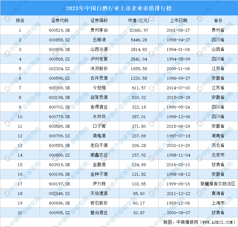 其中,贵州茅台市值最高达21681.97亿元,五粮液、山西汾酒排名第二和第三,市值分别为5446.28亿元、2814.82亿元,泸州老窖、洋河股份、古井贡酒、今世缘、迎驾贡酒、舍得酒业、水井坊进入前十,依次排名第4-10名。