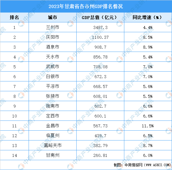 从各地区生产总值排名情况来看,2023年省会兰州市实现生产总值3487.3亿元,比上年增长4.4%,排名第一;庆阳市GDP实现生产总值1100.37亿元,同比增长8.5%,排名第二,是除了省会兰州外GDP总量在千亿以上的城市;酒泉市实现生产总值908.7亿元,比上年增长8.9%,排名第三。