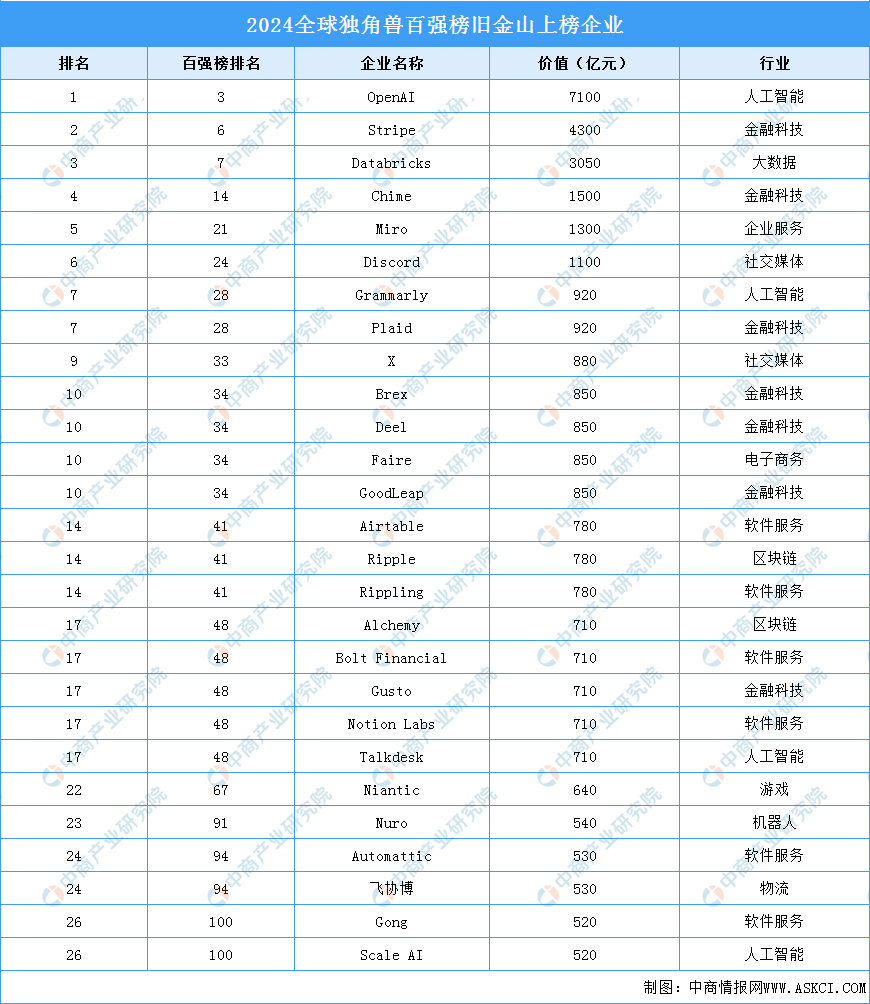 “2024全球独角兽百强榜”中,从城市分布来看,旧金山共有27家企业上榜。OpenAI、Stripe、Databricks、Chime、Miro、Discord这6家公司企业价值超千亿。其中,OpenAI企业价值达7100亿元,居全球独角兽百强榜第三名。