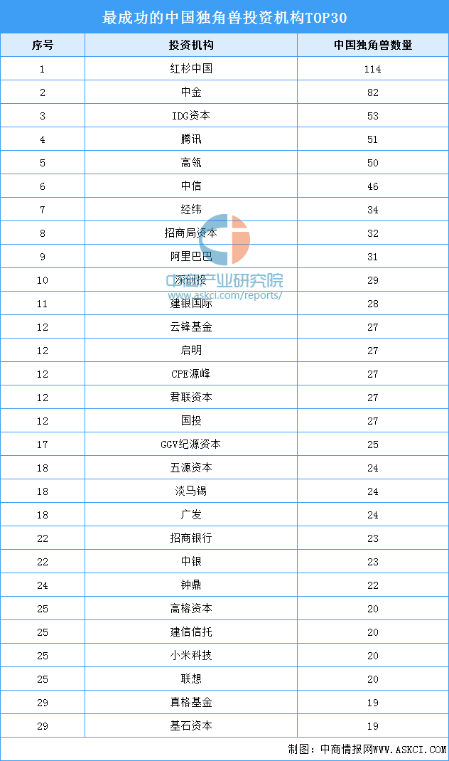 中商情报网讯:近日,胡润研究院发布了“最成功的中国独角兽投资机构TOP30”。榜单显示,红杉中国、中金、IDG资本、腾讯、高瓴、中信、经纬、招商局资本、阿里巴巴、深创投等上榜。