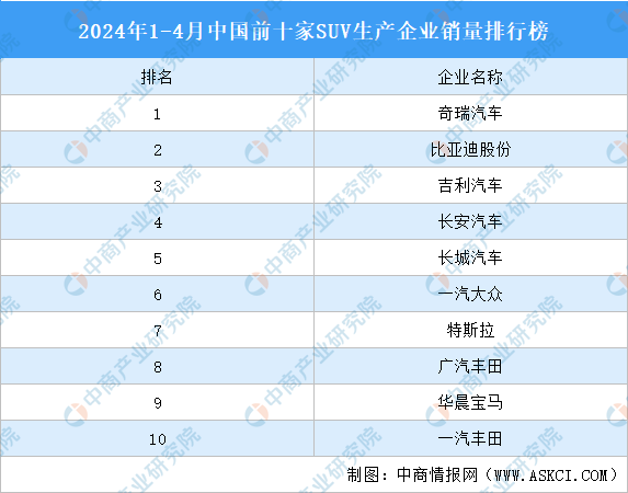 中商情报网讯:2024年1-4月,销量排名前十位的SUV生产企业共销售264.9万辆,占SUV销售总量的65.3%。奇瑞汽车销量最高,比亚迪股份、吉利汽车排名第二和第三,长安汽车、长城汽车、一汽大众、特斯拉、广汽丰田、华晨宝马、一汽丰田进入前十,依次排名第4-10名。